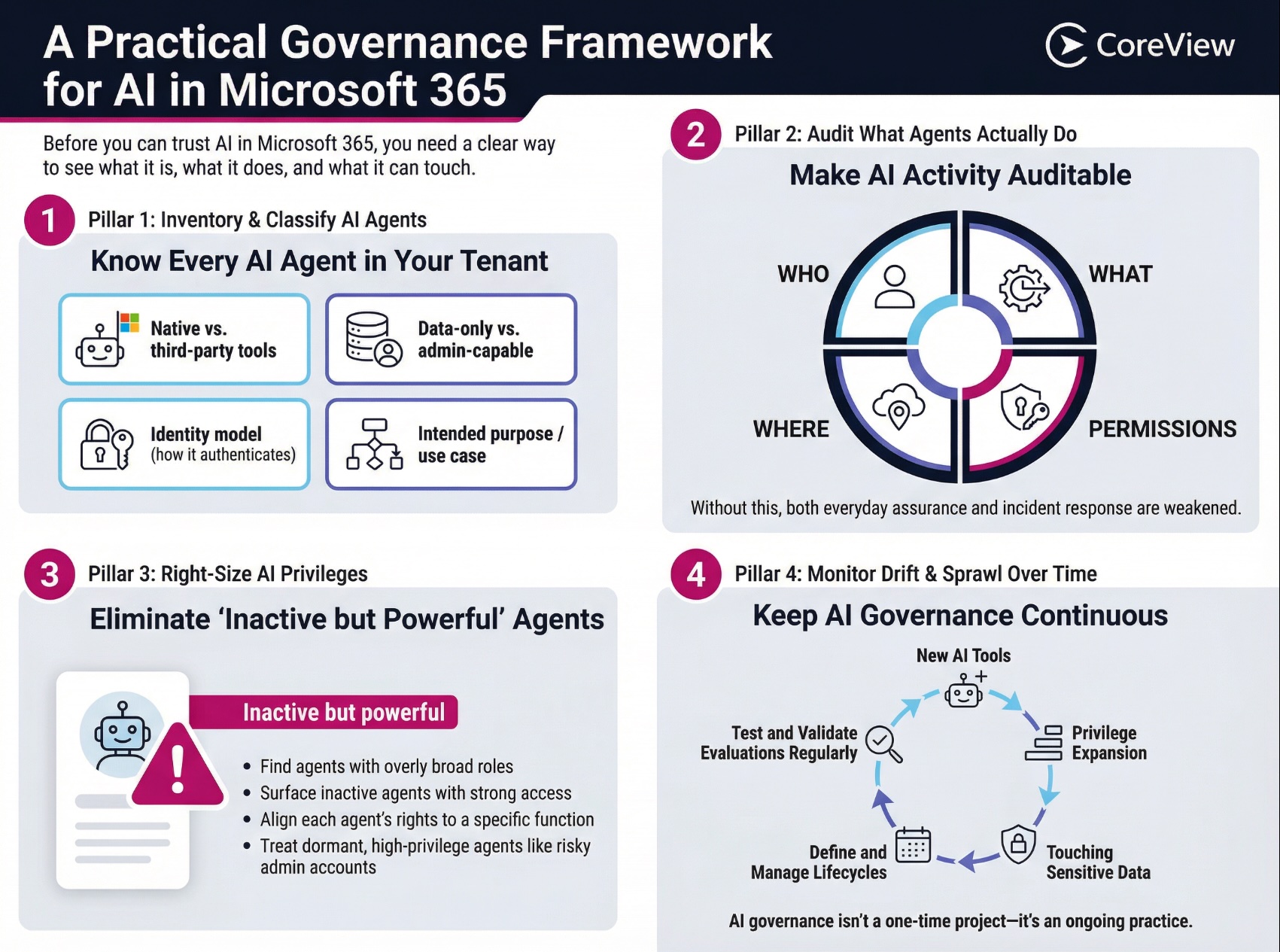 First, it needs to inventory and classify AI agents. Organizations need a catalog that distinguishes between native and third‑party tools, between data‑only and admin‑capable agents, and that documents each agent’s identity model and intended purpose.