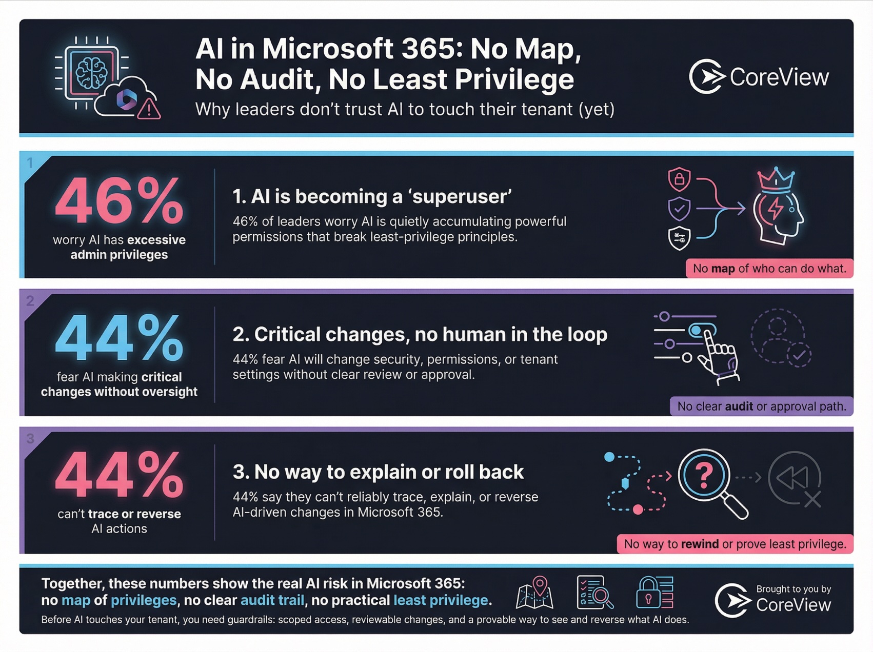 AI in Microsoft 365 is arriving faster than most organizations can govern it. According to our 2026 State of AI in Microsoft 365 report, 70% of C‑Suites are encouraging AI use and 33% are pushing hard for rapid adoption, yet 53% of admin teams say AI is being deployed faster than they can put safeguards in place. As Copilot, Microsoft Agent 365, and third‑party assistants fan out across tenants, least privilege and strong guardrails are the only realistic way to keep AI‑driven change safe and explainable.